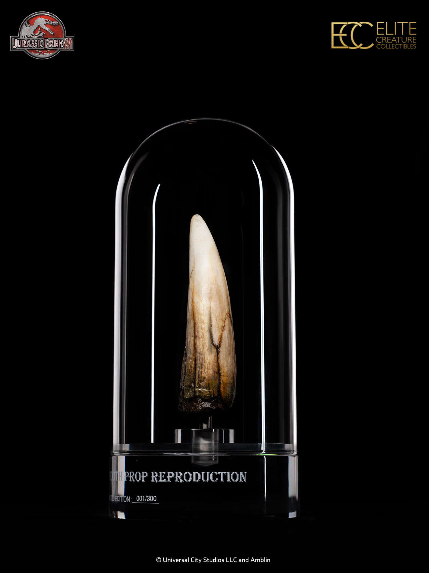 Elite Creature Collectibles is proud to present this Spinosaurus Tooth Prop Reproduction for Jurassic Park fans and collectors. The prototype tooth was further refined by legendary special effects artist Rob Hinderstein, who added additional cracking and scratch details to enhance screen accuracy.